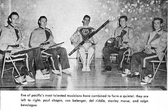 | From the 1956 Pacificana, the wind quintet that some older band friends (seniors, that year) organized. Here, in their band uniforms, at center, foster brother Del Riddle complete with handsome drum major outfit and the bassoon which he played very impressively. Paul Chapin, at left was also very creditable on his flute. Pity they couldn’t quite manage to spell Ralph Bevilacqua’s name correctly… Dunno whether it would have helped if they could have translated it as “Drinkwater.” |