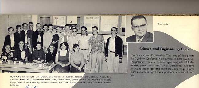 | The Science and Engineering Club, advised by math and physics teacher Don Lundy, was a pretty obvious membership for a math-science major with long-term academic pretensions. So, here I am. All the same, I can’t say that I recall any specific meeting or activity. The kids in this yearbook shot were among my acquaintances, some (Hap Cardwell and Dave Ulrich) dating back to our days at Elizabeth Bradley, and several were current Key Clubbers, but none were then in my very restricted circle of intimates. If, indeed I can properly be said to have had any. |