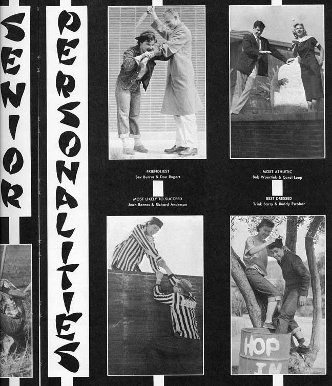 | Same names, same faces in the “Senior Personalities” pages of the 1958 Pacificana. Not surprising, of course, but it does tend to support Gladys Dyal’s “principal’s pet” allegations. Nice of Jeannie Barnes to help me over the wall… |