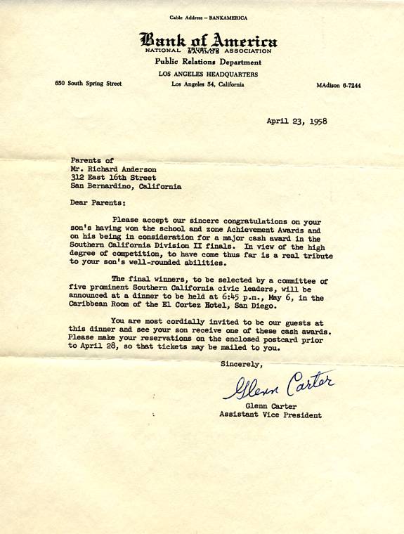 I started out this section with a cocky assertion that our Pacific High School, in those days, was arguably the best of California’s best. The Bank of America Southern California scholarship competition for 1958 provides some solid evidence in support of that claim. Here’s a letter the folks got from them in the spring of my senior year. |