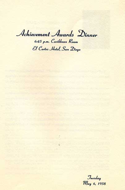 Interestingly enough, our three finalists (each at this point guaranteed some cash winnings) would only weeks later be named Pacific’s three co-valedictorians for 1958. So, when the 28 finalists (four from each of seven Zones) gathered at the El Cortez in San Diego on 6 May 1958, Pacific was lopsidedly well-represented… |
