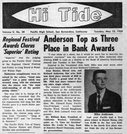 Jeannie Barnes and I each came home with third prize scholarship money of $250. We don’t seem to have a record of the distribution of the other prizes, but this Hi Tide piece says that no other school had as many as Pacific’s three. |