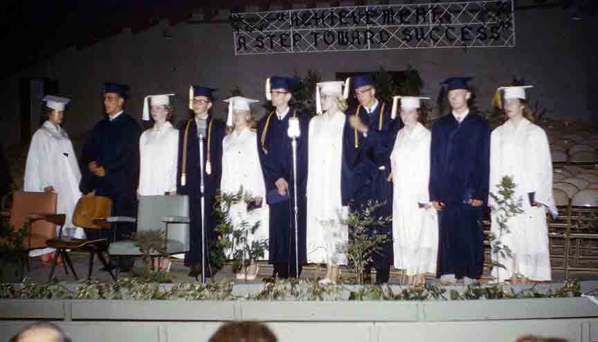 It was rather a big deal, socially, this pairing off for Graduation. Not at all sure I fully understand it, even now. Nor expect to. I’m not aware that any of the couples in this picture were anything like “going steady;” Alice and I surely weren’t. In those days, I wasn’t “going with” anybody. The girls I dated now and then were uniformly younger than I; less scary, that way. Truth be told, I was pretty much afraid of my contemporaries, as a group. Alice, a comrade from LOLA and a good kid, made it clear that she really wanted to be my partner here, and that was OK by me. Note, by the way, that the motto on the wall has reverted to the secular (and rather pedestrian) text they displayed at the awards assembly… |