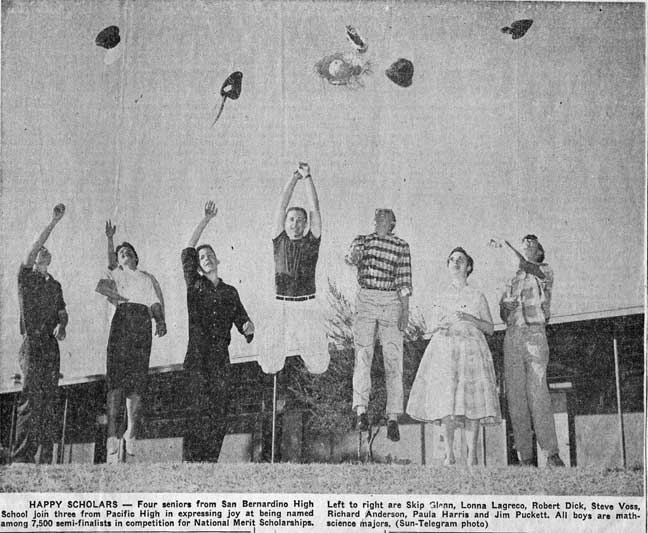 | A similar pattern, contrasting Pacific with cross-town rival Berdoo High and also with the national population: when the National Merit Scholarship Corporation’s semi-finalist list came out, three of us Pirates joined four old Arrowview friends (banished to Berdoo High by geography) in well-publicized rejoicing. Steve Voss always was photogenic. But get a load of that Anderson jaw-line! |