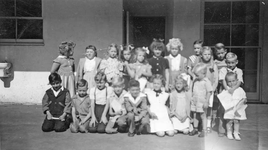 Can’t decide whether we kids are dressed-up enough for a Sunday meeting; since Primary met on a week-night, in those days and for decades to come, that would help decide.