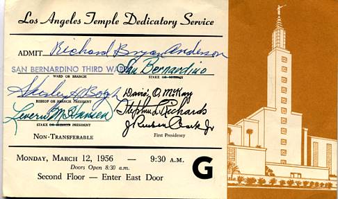 This was a huge event for us of the “Inland Empire.” Until the Los Angeles Temple opened in 1956, our nearest access to temple worship was in Utah (Saint George — thirteen pre-Interstate highway hours away) or Mesa, Arizona (somewhat closer, but still a long bus ride). |