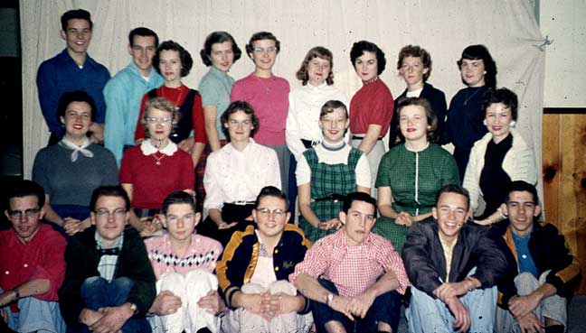 San Bernardino Third Ward Seminary, 1956 Top: Jerry Simons, [?], Carol Poulsen, Kay Lewis, Pearl Heath, [?], Margie Fulkerson, [?], Kay Barber Middle: Jackeen Morgan, JoAnn Bogh, Bonnie Butcher, Klar Clawson, Ann Richards, [?] Bottom: Vaughn Lewis, Duane Jones, Gordon Millett, Moon-faced Young Self, Gilbert Snow, Paul Richards, Del Riddle |