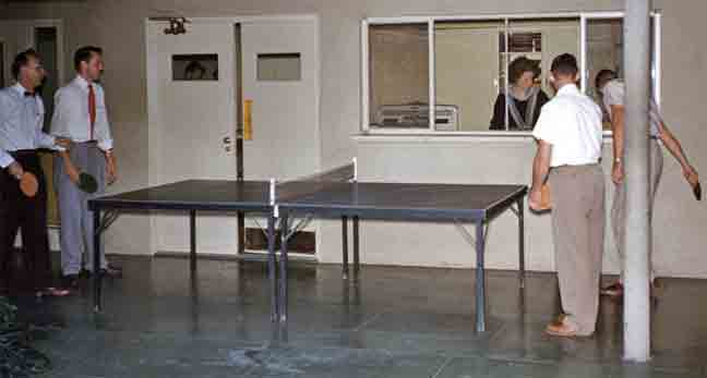 | Some Saturdays, the folks would drive to Los Angeles, to Paul Dunn’s office at USC. They’d spend the morning in Seminary management and curriculum meetings that we could sorta hear through those windows, while Brent and I enjoyed the ping-pong table and neighboring library stuff. Pappy snapped the dignitaries in their shirtsleeves, during a break. |