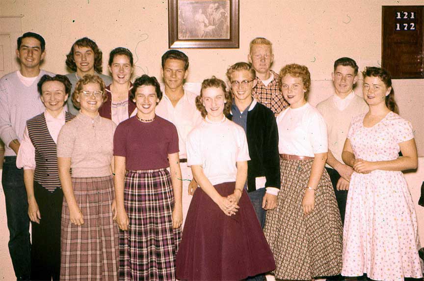 | Somebody will correct my leaky memory (please!), but I believe that Rita Skousen Miller pioneered Seminary in Colton, just south of Rialto and west of San Bernardino. These kids are my approximate contemporaries: isn’t that Wayne Tolman, the tall chap just behind Rita at left? Wayne married old friend (of Valerie’s and mine) Earlene Fogg; we last heard from them via e-mail from Alaska. |