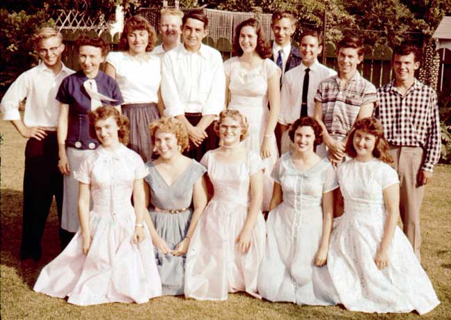 | A strongly-overlapping Colton Seminary group, a bit more dressed up, posed and snapped very skilfully in what looks to me like Woodrow’s and Rita’s back yard. I’m guessing the year after the one on the previous page. One’s tempted to finger Woodrow as the shutterbug, but I found the slide in Pappy’s collection. |