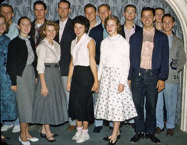 | These are San Bernardino kids, and I recognize more of them than I can name. Until somebody corrects me, I’ll assert that Gordon Rex Babb, a very close family friend and (early on) neighbor, taught them at the Second and Fourth Ward chapel on Waterman Avenue; he’s the tallest one, third from the left in the back row. Valerie wonders what ever became of Jerry Stickel (spectacles), and I do remember Richard Ririe, the rightmost of this group, in his music letterman’s sweater. |