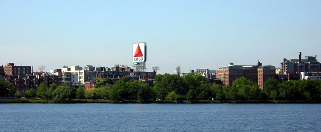 | Westward along the Charles, shading from Boston through Brookline into Allston and Brighton, the current skyline looks more like my memories. The Citgo sign was green, back when I was alive, and it said “Cities Service.” The lighting towers near its base belong to Fenway Park, then and now home to the American Baseball League Boston Red Sox. |