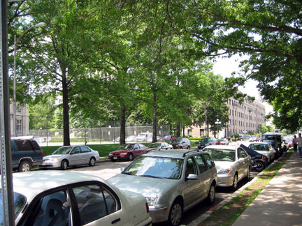 | Then, in the other direction, northishly from Ames Street’s t-intersection with Memorial Drive, the East Parallel is obvious, but you have to look hard to glimpse the matching West Parallel through the trees and the tennis courts. A rear corner of Walker Memorial appears at far left. |