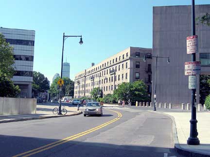 Looking southwardish down Ames Street toward East Compost, the Charles, and Boston, you can see “the Pru” in the background. |
