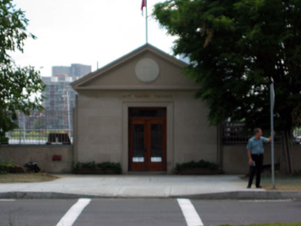 Near the end of Ames Street, with the river and Boston in the background, stands the Sailing Pavilion.