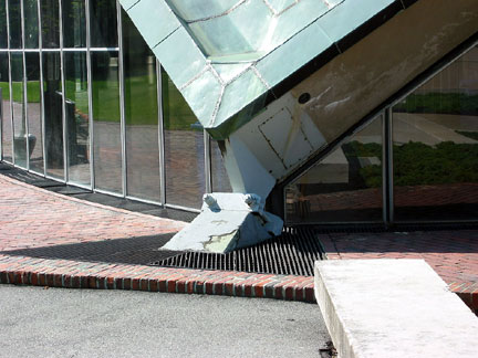 We heard a good deal back then, naturally enough, about the engineering wonder that is Kresge. Its roof is a spherical triangle of concrete, poured (if I recall correctly) all at one session, and tapering from a couple of feet thick at each apex to some gossamer thinness at the top. Never verified the bit about the top, but here’s one corner, resting on a concrete pier and attached by impressive bolts. |