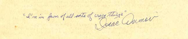 I wasn’t a big joiner. Didn’t really collect affiliations. Had my trencher already well stuffed with studies, activities, and East Campus shenanigans, and had never taken the trouble to walk across Ames Street to a meeting of the SFSMIT. But the prospect of meeting Asimov titillated my undergraduate soul. In those days, Asimov was still married and lived in Newton. And, as it turns out, he loved to hang out with the undergraduates of SFSMIT (The Science Fiction Society of MIT), which met on Fridays at 5:00 p.m. in the Crafts Library Lounge in Senior House, just across Ames Street from my digs at 505 Walcott. So, when the bulletin board in Building 10 announced that Asimov would be this week’s speaker at SFSMIT, I decided (without much regret) to postpone dinner at Walker Memorial Commons and to hear what he had to say. Already told you that I didn’t collect affiliations. I didn’t collect autographs, either. Still don’t. Always seemed tacky (though I’m not sure we yet had the word) to walk up to a famous person and ask for a signature. Even worse, to ask the victim to pretend that we were somehow acquainted. As if one would ever ask a real friend for an autograph. But as Asimov bantered with my classmates (he never did get around to giving a conventional speech), I was moved and excited and found I did want some tangible souvenir of the occasion. Forty years later, I can’t recall his announced topic. Not sure he, or we, ever flitted within sight of it. The conversation was more like those bumpy-cars at a carnival than like, say, orderly traffic on a highway. More like Brownian motion than glacial drift. Not much like the lectures we were accustomed to. But I do remember one thing Isaac Asimov said, because I wrote it down on the back of the elegant flyer. At the end of the meeting, I approached the author and asked, with a grin which he reciprocated as he signed: “Dr. Asimov, may I please have your affidavit?” |