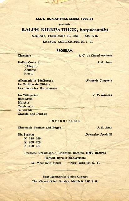 In a community (greater Boston) that’s notoriously saturated with culture, MIT’s Humanities Series stands out as one of the most distinguished clusters. This concert, for example, in the winter of my junior year, brought Ralph Kirkpatrick and his harpsichord to Kresge Auditorium. This was my first experience of live, world-class harpsichord performance. When Kirkpatrick came out and took his “Thanks for welcoming me here” bow, I remember remarking upon his very long arms and fingers. To my embarrassment, the first descriptive term that crossed my mind was “simian.” And then those long fingers started to caress the keyboard, and I was even more distressed to have entertained such an incongruous impression. |