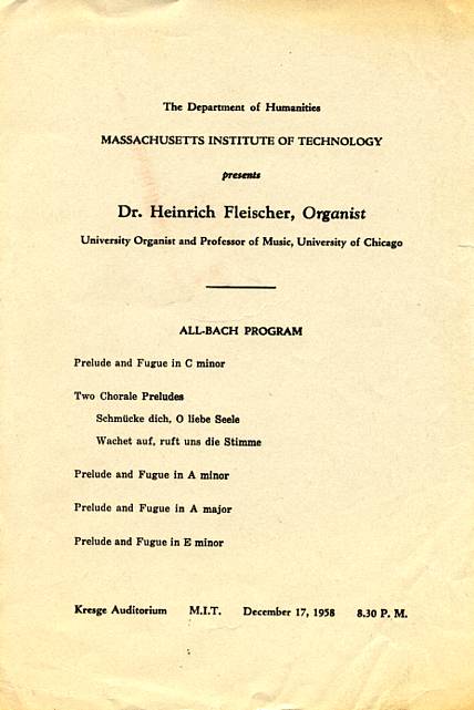Kresge Auditorium sports excellent acoustics and a particularly fine, very modern pipe organ, attractive to many distinguished visiting organists, including Chicago’s Heinrich Fleischer. The Kresge and MIT Chapel organs offered regular schedules of free recitals, on which I would drop in, from time to time.