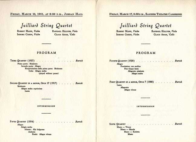 I think that was my first visit to Jordan (the New England Conservatory’s main concert hall). It is certainly a principal reason that I return there whenever I can. Juillard and Bartók were both mesmerizing, and I came away with a firm love and the embryo of an understanding of the music. Nothing could have kept me from Harvard’s Sanders Theatre the next Friday. Not with three more quartets in the offing and one more ticket in hand. Again, I was electrified, confirmed in my conversion, and delighted beyond measure. |