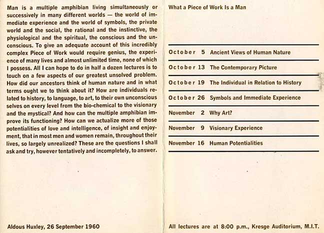 When Huxley lectured to us Tools, three years of mortality remained to him. He passed, as I believe, into a state of far greater perceptual capability on 22 November 1963, but nobody much noticed, because that was also the day John F Kennedy died (C S Lewis, too: a wiser man than either, for my money).