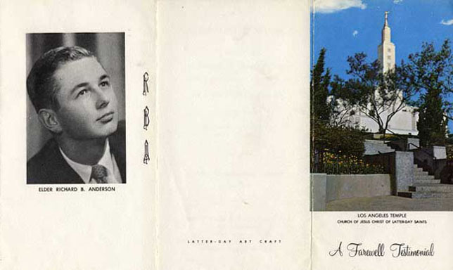 My folks were something on the order of big shots in the San Bernardino Third Ward and the surrounding LDS and educational communities; so, it was to be expected that a fuss would be made over my mission departure. Accordingly, we handed out this nicely (commercially)-printed program at my farewell. This image is very close to actual size.The other side of the tri-fold handout appears on the next page, inasmuch as we lack room here. |