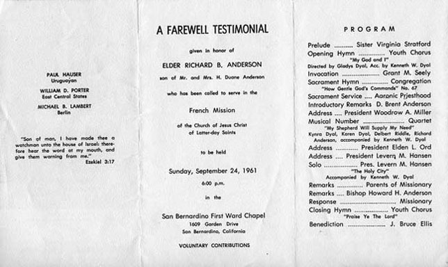 I was particularly grateful that former San Bernardino Stake President Levern M (“Uncle Vern”) Hansen and his dear Elsie came from their home in Huntington Beach to speak and sing at my farewell. Pappy had served as his counselor, some years earlier (with Woodrow Miller, another speaker), and then they had moved away. Yes, this was a a long meeting: an hour and 31 minutes, even though Mammy spoke for only the Sunday-school-sanctified 2½ minutes. A decade before the current three-hour meeting pattern came along, no other meeting was scheduled at the end of this one, and so if we ran over, we ran over. 1I’ve recently (2010) come across and digitized1 the recording (1/4-inch magnetic audio tape) that the folks made. Something went wrong with the recording, about 49 minutes in; so, much of it’s hidden behind hum and distortion. Including, alas, Mammy’s brief talk. But what a joy to hear Woodrow, once again, address a congregation as “My Good People!” (click here to hear him). You’re welcome to hear it or to have it; you’ll have to ask, though: audio files, even MP3s, are big. At 88 MB, this one would swamp this little hyper-archive. I keep it at Archive>Content>Audio>MT |