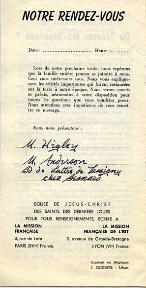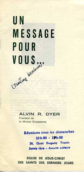 | This was before President Dyer became a supernumerary counselor in the First Presidency. While serving as the very energetic president of the European Mission, as I understand it, he was largely responsible for the policies underlying “baseball baptisms” and other (arguable) excesses in proselytizing (we called it proselyting) technique. While I was in Rennes, he was replaced by N Eldon Tanner. Some said, “The Dyer Fire” has been damped down by the “Tanner Manner.” In later years, each would serve in the First Presidency. |
