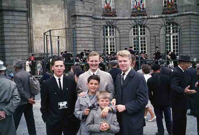 | August 15 (continued)—In front of the bandstand, the three missionaries are Elders Dan Aldridge, David Halliday, and Dee Peterson. The boys, if I recall aright, are Henri and Jean Daviron. |