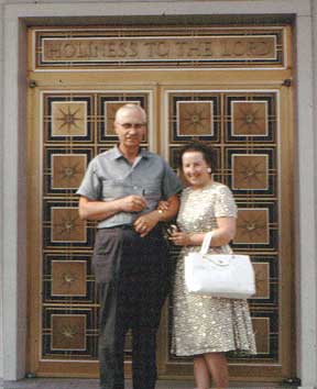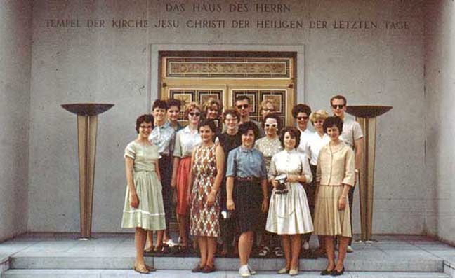 After a lifetime of teaching French language and culture, all the while wishing he could go and absorb it himself, Pappy finally got there while I was in Paris. Valerie (who was living with them on Sixteenth Street) says it was Mammy who made it happen. But then, let’s face it, Mammy made most things happen. They brought a BYU travel study group over. By the time they got here, they’d already touched down in a number of exciting places. One of their students must have taken this shot in Zollikofen (a suburb of Berne), Switzerland, by the front door of the first LDS temple ever built in Europe. I had to straighten and adjust this photo quite a bit. Ample evidence that somebody less skilled than Pappy was holding Pappy’s camera. |