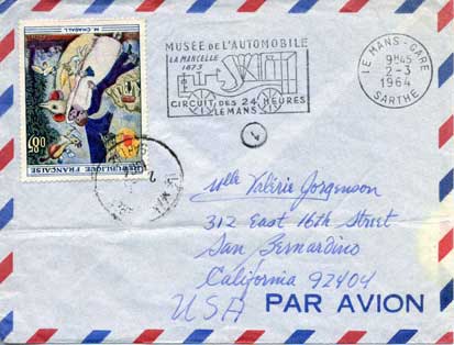 Well, today (22 November 2010), I came across a letter that I’d mailed from Le Mans on our Cyndi’s minus-eighth birthday, 2 March 1964. Bearing, upside-down (of course) the (then-) new stamp depicting Marc Chagall’s “Les Mariés de la Tour Eiffel,” (which, as I learned only later, Valerie dislikes), it was mixed up with photos and other miscellaneous memorabilia, quite separately from the beribboned correspondence and the bound journal. |