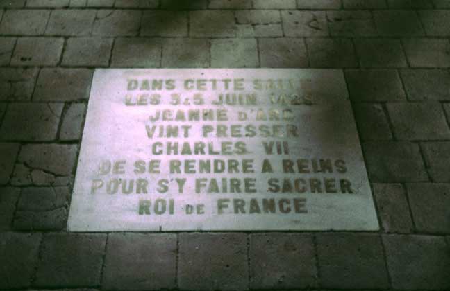 I was also aware that it was here that Joan of Arc finally chased down the Dauphin Charles, confronting him on the paving-stones of the great hall. We walked, reverentially, on those stones. In case you can’t read the plaque they put up on the 500th anniversary, here it is, a little bigger (pax Harold Ross):