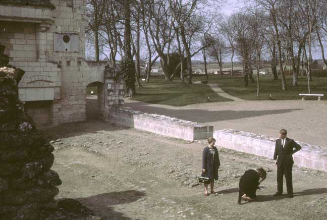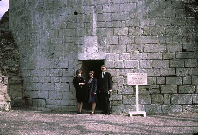 The same trio, now posed in the doorway of the Tour du Coudray, where, as the sign says, Saint Joan “resided” seven weeks, until the 20th of April. Not, by all appearances, an accommodation which even the tolerant French would describe as affording le grand confort. |