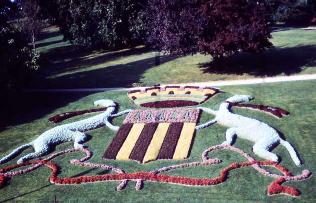 | Near the center of town, in the Parc du Thabor, they depict the coat of arms of the Duchy of Bretagne in flowers. The animals are ermine; the five symbols in the pink bar under the crown are ermine tails. They like white weasels, in Brittany. |