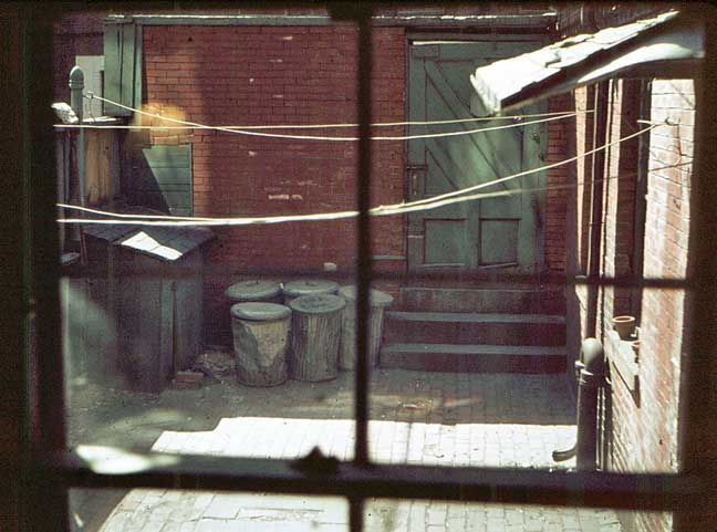 The view (our southern exposure) out that window3 onto what Miss Krauss called “the pahtio” still burgles up wry and tender smiles chez moi. The window extends to the right, but the part you can’t see looks out on a brick wall a foot away. |