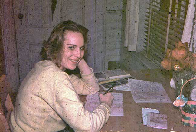 An about-face, once again, and we see the southeast corner of our space, with Valerie writing letters1 at our wellbeloved multipurpose2 table.
