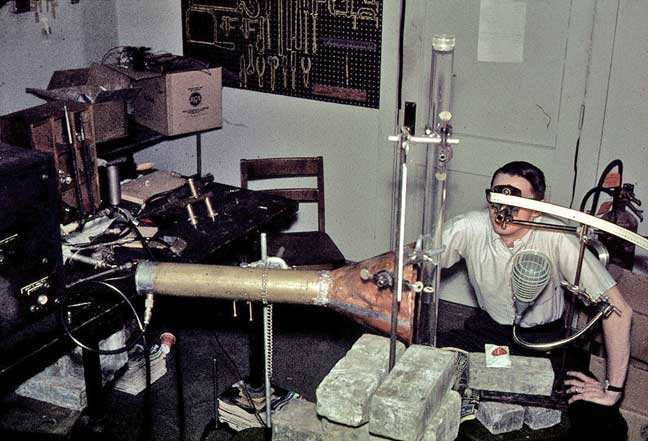 | With classmate Joe Ladish, I undertook what we called (though never to its face) “Project Urinal” to satisfy the Senior Thesis requirement. Professor Clark consented to supervise the project, which actually ended up comporting a modicum of originality.1 Joe and I became the very first,2 as it turned out, to demonstrate, physically, experimentally, and quantitatively, that photons of electromagnetic radiation carry angular momentum (that is, that they “twist as they go”).3 The “Urinal” was actually a wave-guide which we designed to produce circularly-polarized4 microwaves; we tuned it with the two brass screws you see hanging down. A cylindrical absorber was suspended as a torsion pendulum, and the gizmo Joe’s looking through measured the angle through which the absorber twisted when we turned on the juice. |