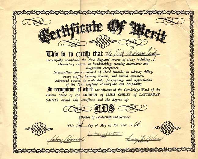 As we said goodbye to the Cambridge Ward—forever, as we supposed—our friends there gave us, “the Dick1 Anderson family,” this certificate to remember them by. Also a brick which, they assured us, person or persons unknown had pried surreptitiously (and probably nocturnally) from the Brattle Street sidewalk. The brick still functions as a doorstop at Chankly.