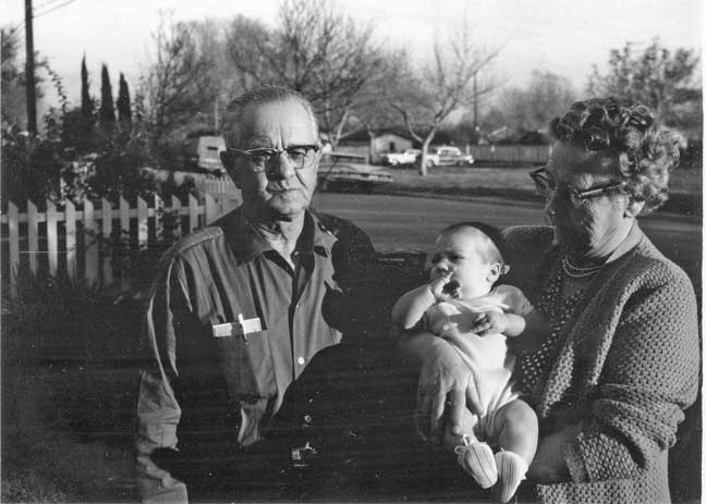 | Come Christmas break (I think we still called it that, even at Godless Stanford), we motored down to San Bernardino. As did Grandpa and Grandma Anderson, all the way from Utah. The front yard of the homestead at 312 East Sixteenth Street provided a backdrop for the intergenerational gathering. |
