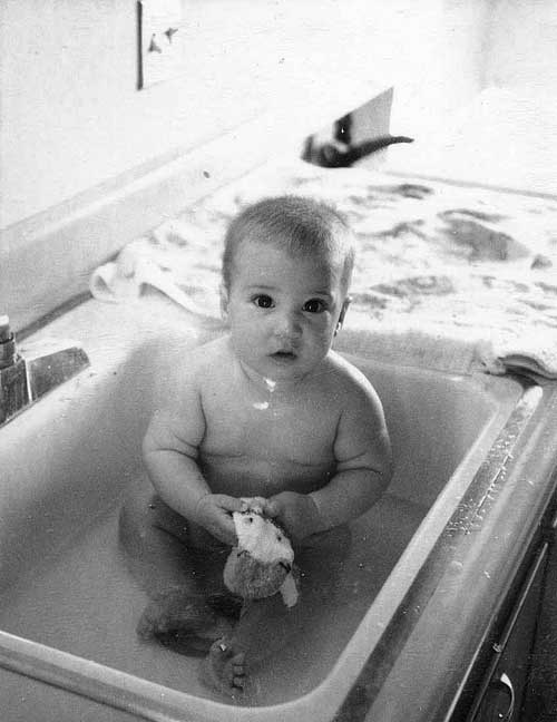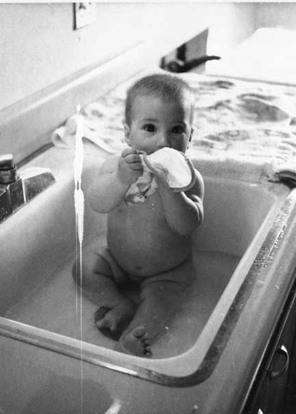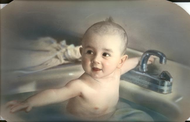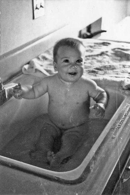 OK, you be the judge. Here we are both, Rick (March, 1966) and I (August 15, 1941), each at the advantageous age of six months, depicted under similar circumstances. My likeness, at left, benefits enormously by Pappy’s photographic technique and hand-tinting. Rick’s three images, above, suffer from my amateurish if loving Polaroid skills. |
