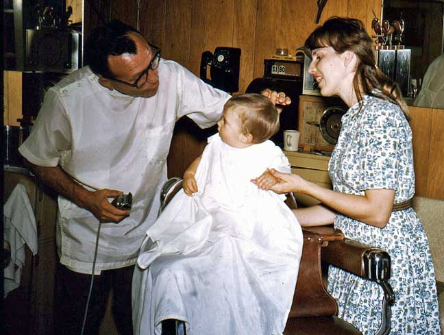 George Robinson, who had cut my hair and Pappy’s (probably Brent’s, too) for years, administered Rick’s first haircut with flair and aplomb. Handled smoothly Rick’s mild apprehensions. No reason the cast should have bothered him, and it didn’t. Rather a classic scene, don’t you agree? |