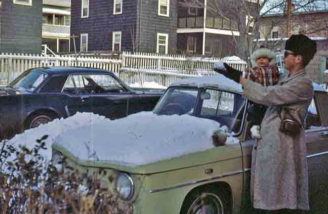 | Pappy holds little Rick in front of 49 Sycamore. That grin surely reflects his feelings toward his first grandchild, rather than toward the snowy setting. Of which he sincerely disapproved. |