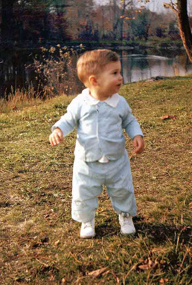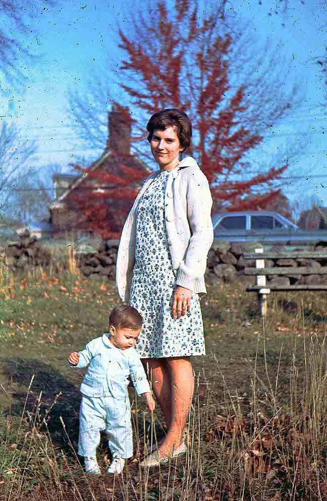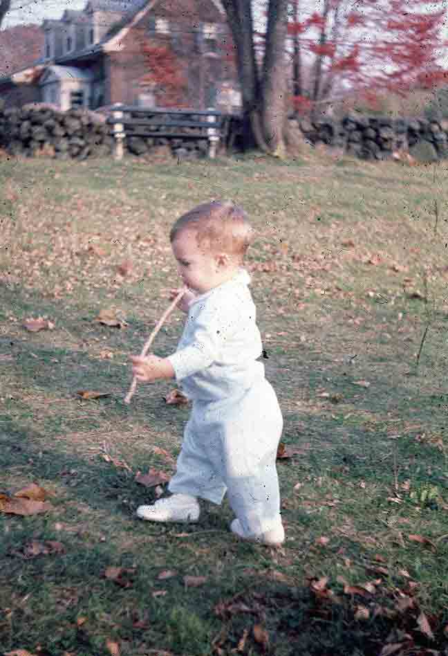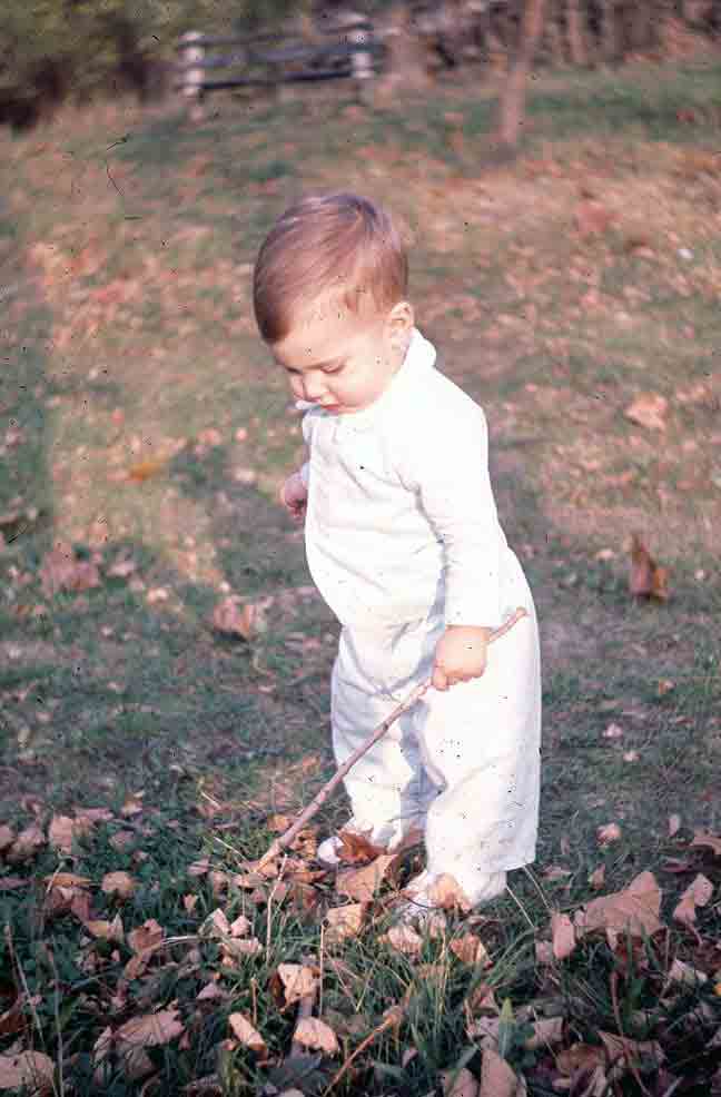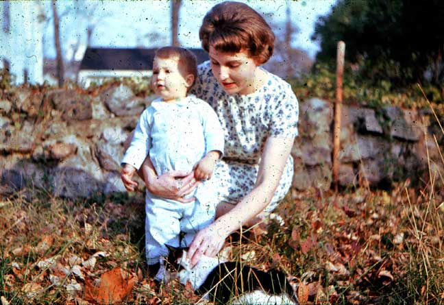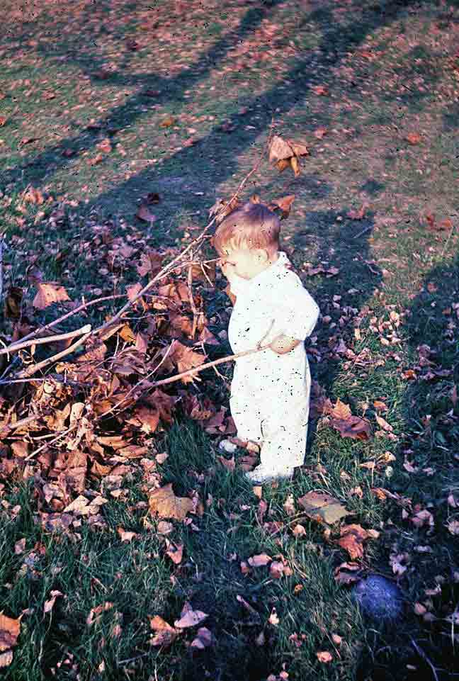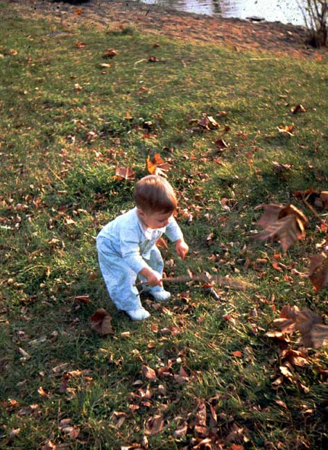 Arriving in New England with its famous autumn coming on, this time blessed with an automobile, we did get out, as Pappy used to say, to “see the pretty.” Bringing with us, moreover, a worldbeatingly cute toddler, we felt a duty to capture some photographic evidence of our passage. This looks like Beaver Brook, just west of home in Belmont. We’d already used up Merritt’s box of Polaroid film. |