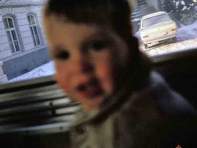 Same vehicle (maybe); location uncertain; same Cutest Representative of our delegation. More than just his fingers, this time. But blurry. Oh, well… |
