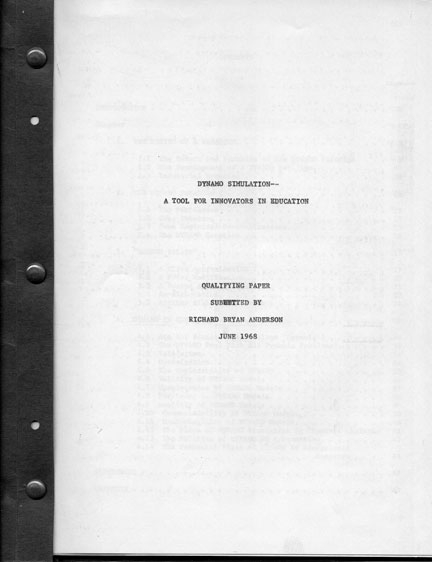 For these three worthies, my thesis project was their first exposure (and, I suspect, their last) to Forresterian ideas and techniques. Accordingly, with their gracious concurrence, I asked Jay Forrester if he would serve as the fourth member of my committee. He agreed, to the perceptible relief and gratification of the HGSE contingent. Formally, of course, as an MIT professor, he could only “advise” the committee. We all expected, whether we said so or not, that he would understand the process and the product better than his fellows, for obvious reasons. |