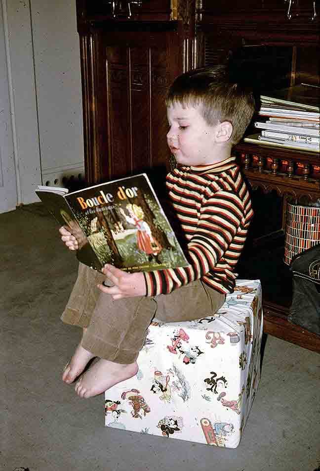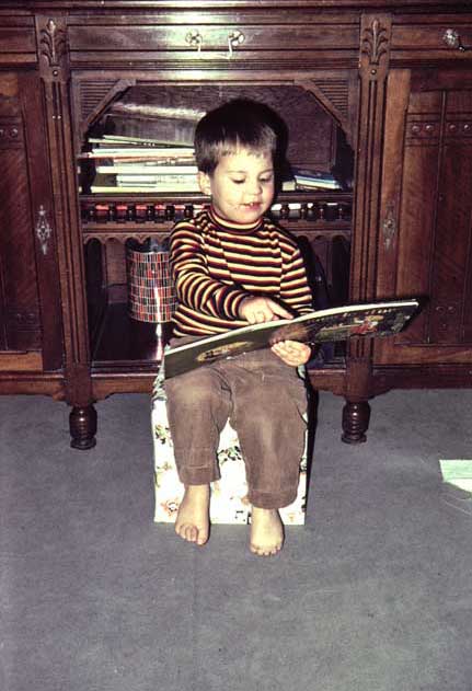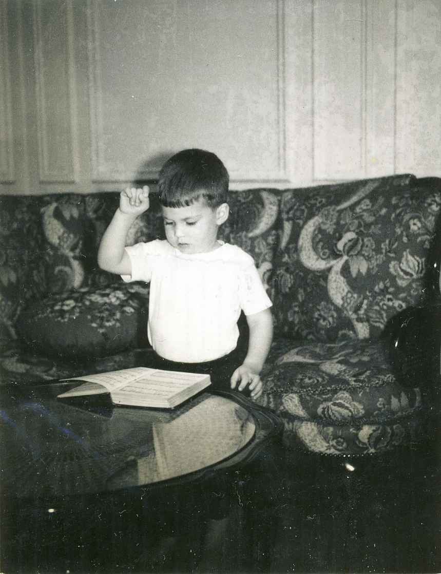 If you don’t want to hear about Rick’s precocity, you’d better steer clear of us. Reaching only to the level of hyperbole customarily allowed to parents of gregarious firstborn children, we’ll tell you that he read to anybody who would listen, that he conducted the music (usually to records), and that he actually performed on the Mission’s grand piano. Well, almost—this shot of Pappy’s was pure grandparental setup, and Rick’s considerable instrumental skills would come later and would cluster primarily in the string section. |