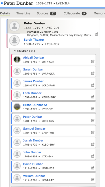 Moreover, the only fifth-generation William Dunbar listed in the General Society’s “Silver Books”* as a Richard Warren descendant was born in 1754. No, I fear that the nice people at FamilySearch have fallen victim to their own openness and catholicity: Anybody with a computer can put anything he chooses into the FamilySearch Family Tree. We contributors are encouraged to source our assertions carefully, but nothing in the procedures of FamilySearch prevents an amateur genealogist or one who aspires to prominent ancestry from inventing his own version of the past. And if you correct a cherished error of mine, I’m, alas, at liberty to go back in and correct your correction, without obvious limit. |