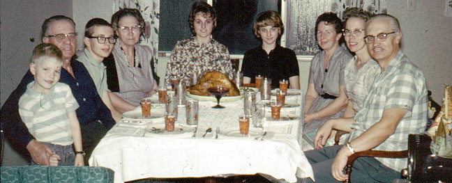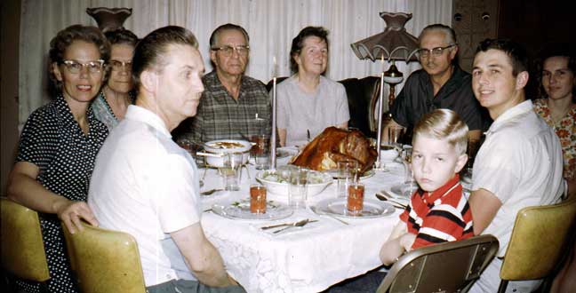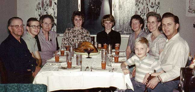 | We think this one happened in July or August of 1966, as Valerie and Rick and I were driving back to Boston and doctoral studies at Harvard. Pappy and Mammy drove with us as far as the tepees of the Crow Nation in South Dakota, where Ken and Verna Carter were serving as missionaries. We had Thanksgiving in the summertime in Sunset, since we wouldn’t be around in November. Scott’s uncharacteristically dour. Brent is apparently on his mission in Switzerland. Baby Rick’s probably asleep in an adjoining chamber. |