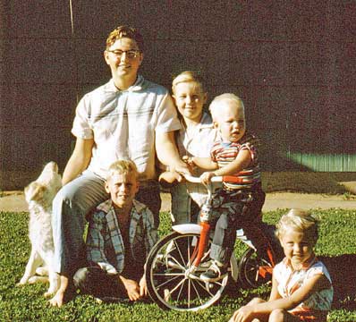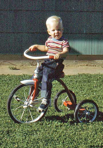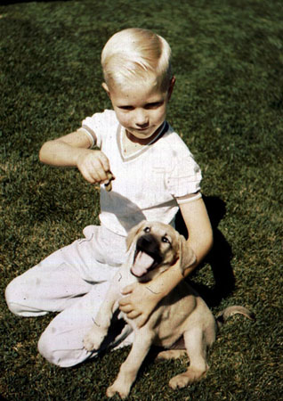 Scott was visibly pleased to have this new tricycle for, I think, his second birthday in 1956. In the back yard in Sunset, all we cousins gathered around him on it. Left, clockwise from cousin-dog Boots on the left: me,
