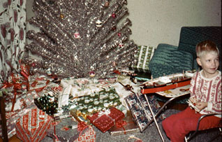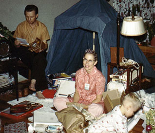 As of this writing (early 2004), she still goes by “Loophie” in our branch of the family. The story was that “Oophie” was as close as my (then small) mouth could come to ldquo;Ruthie.” The further distortion of her name appears to reflect an elision of “Little Oophie.” Unclear that that part was my doing. Not sure just when or where this shot was taken; I wasn’t into shutterbuggery early enough to get any teenage likenesses of my very favorite auntie. Maybe somebody in the family will share. We do have her as a twelve-year-old in 1936, watching my folks open their wedding presents. |